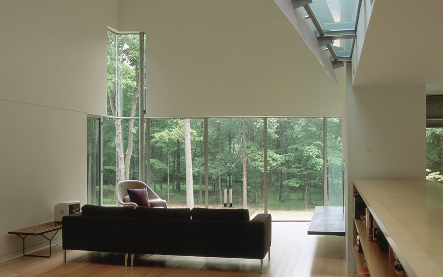 This residence, the winner of a Chicago Atheneum American Architecture Award, is set in a heavily wooded site in Princeton Township, New Jersey. The project is an addition to a centrally organized, late modern house with vernacular influences. With the addition, the house becomes an instrument for interacting with the site. Its principal spaces are contained between a masonry base and wood and steel canopy. A variety of views are admitted between these conditions. As the forest canopy provides abundant shade, the house admits light through its roof and disperses it by the use of translucent inclined partitions.